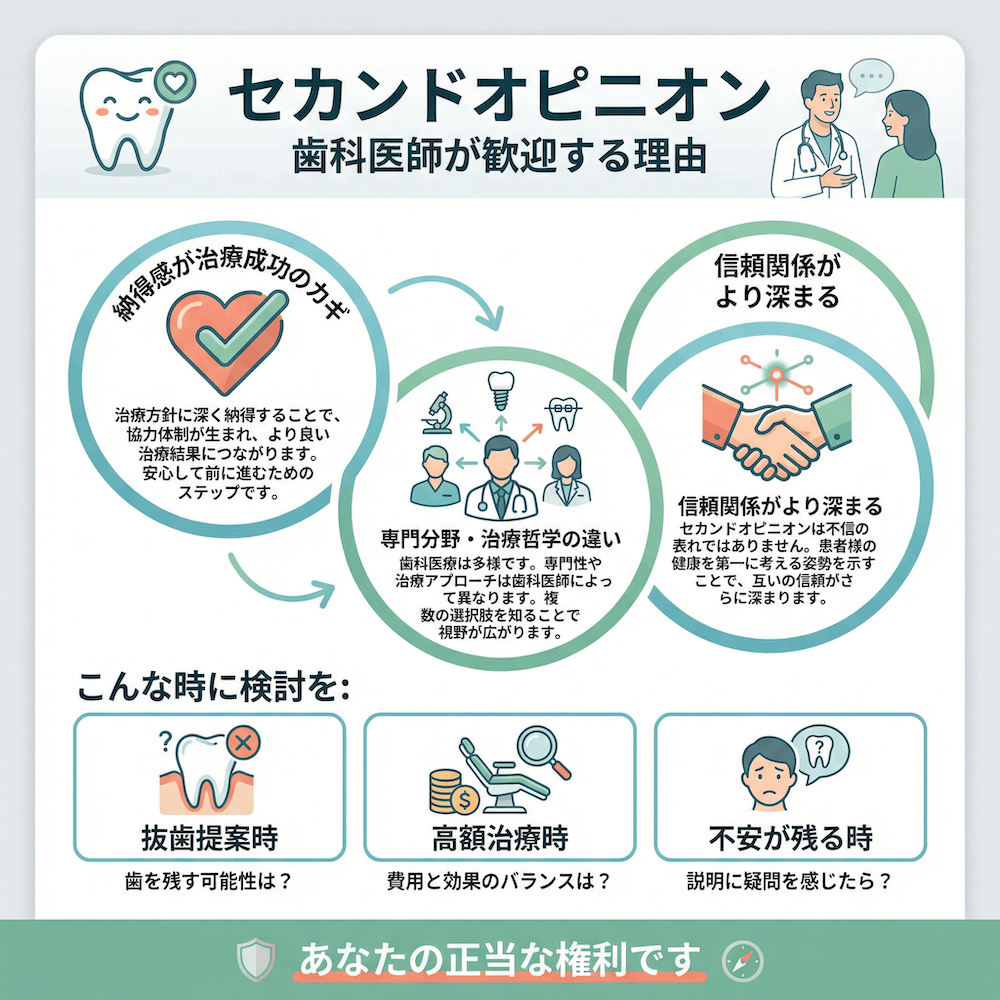 この記事では、そんな患者さんの心の葛藤にそっと寄り添いながら、「セカンドオピニオン」について、私たち歯科医師が日々の診療で感じている「率直な気持ち」をお話ししたいと思います。この記事を読み終える頃には、きっと皆さんの不安が少しでも軽くなり、安心して次の一歩を踏み出す後押しになればと願っています。